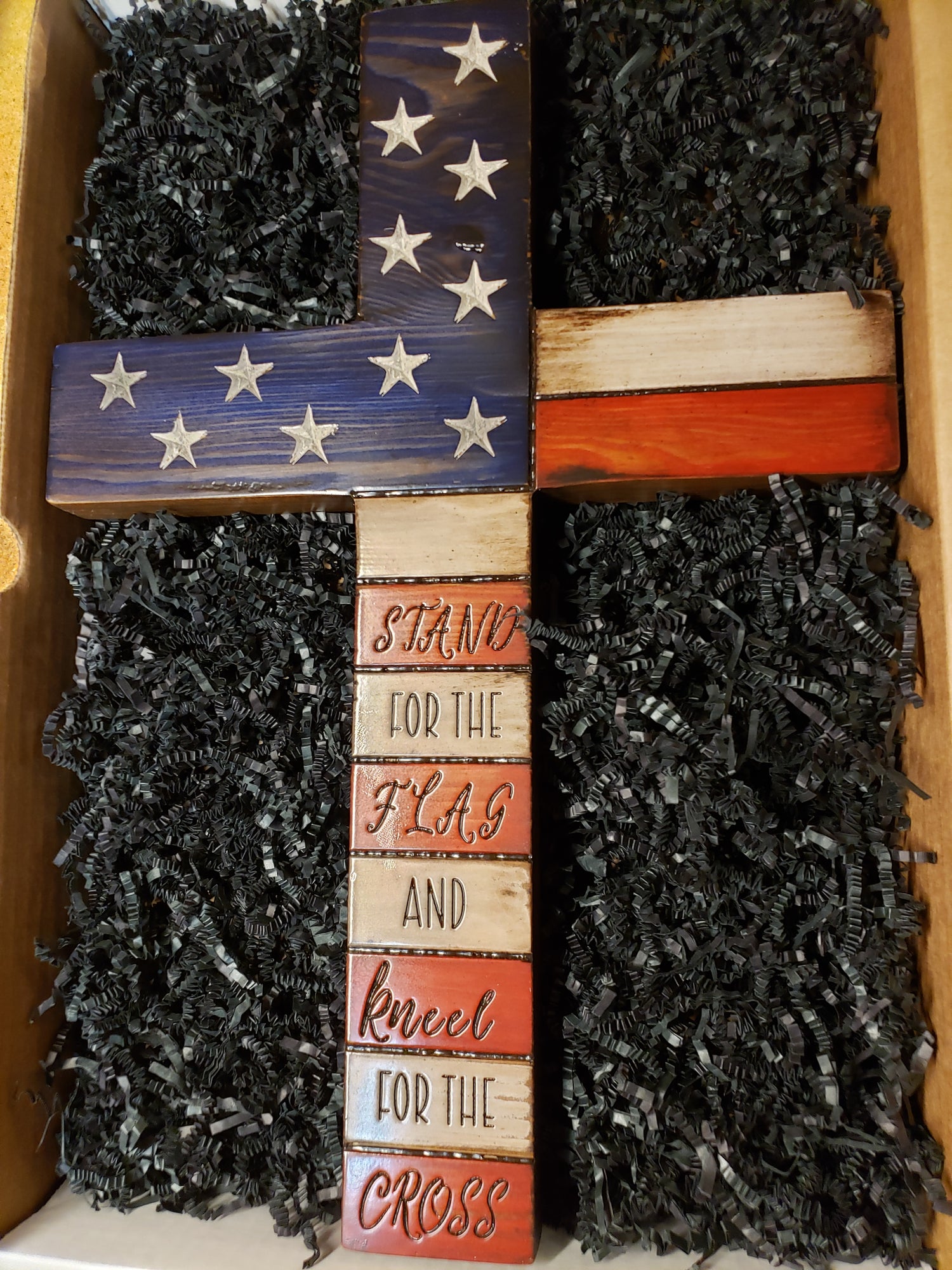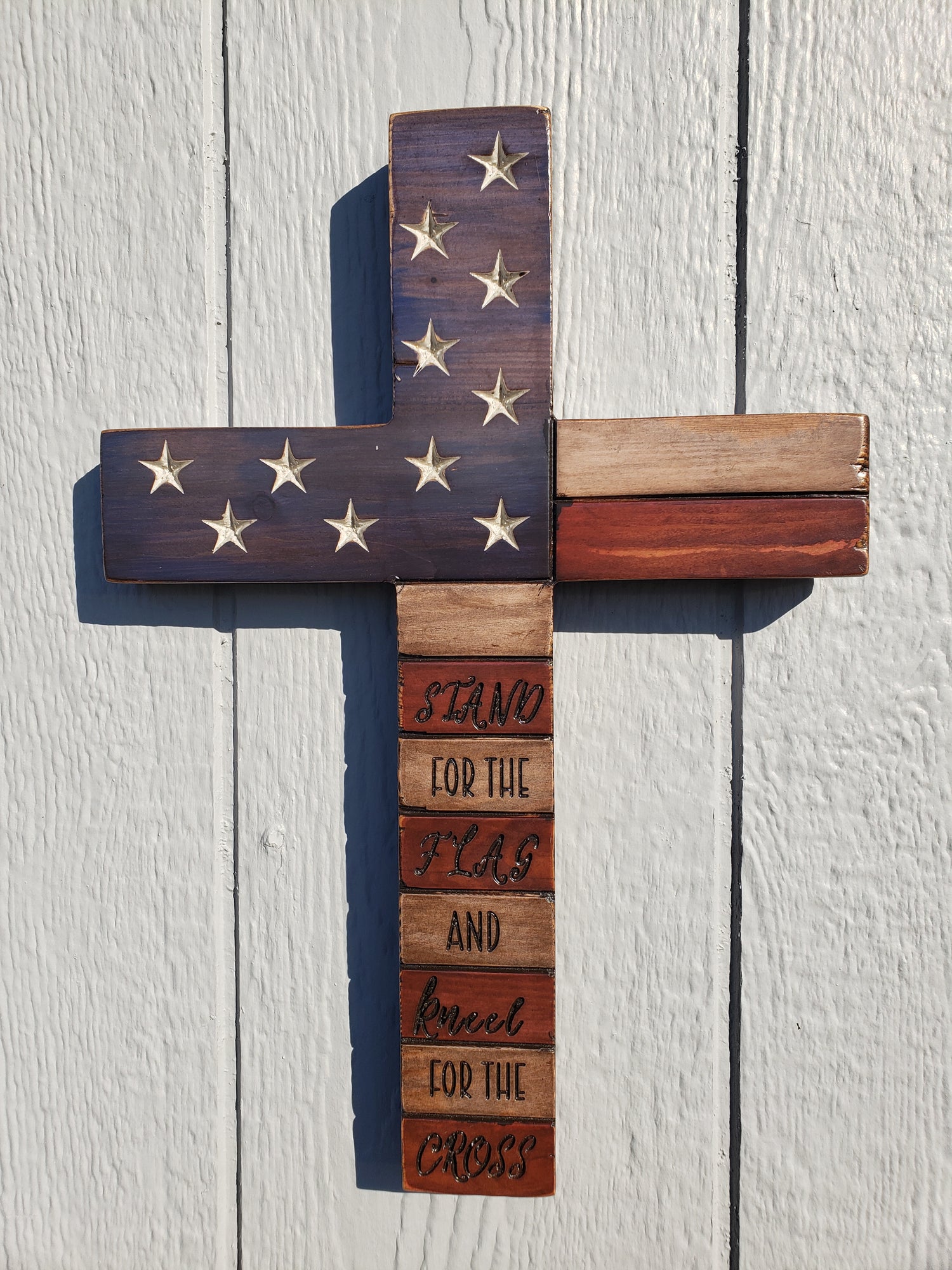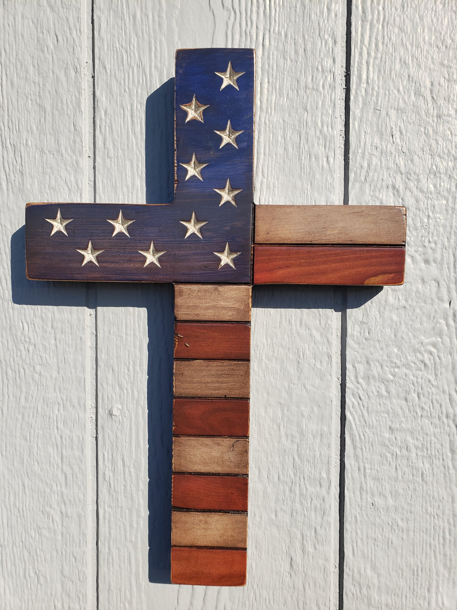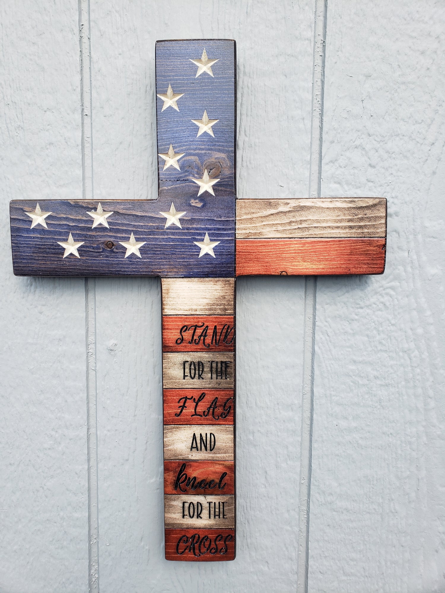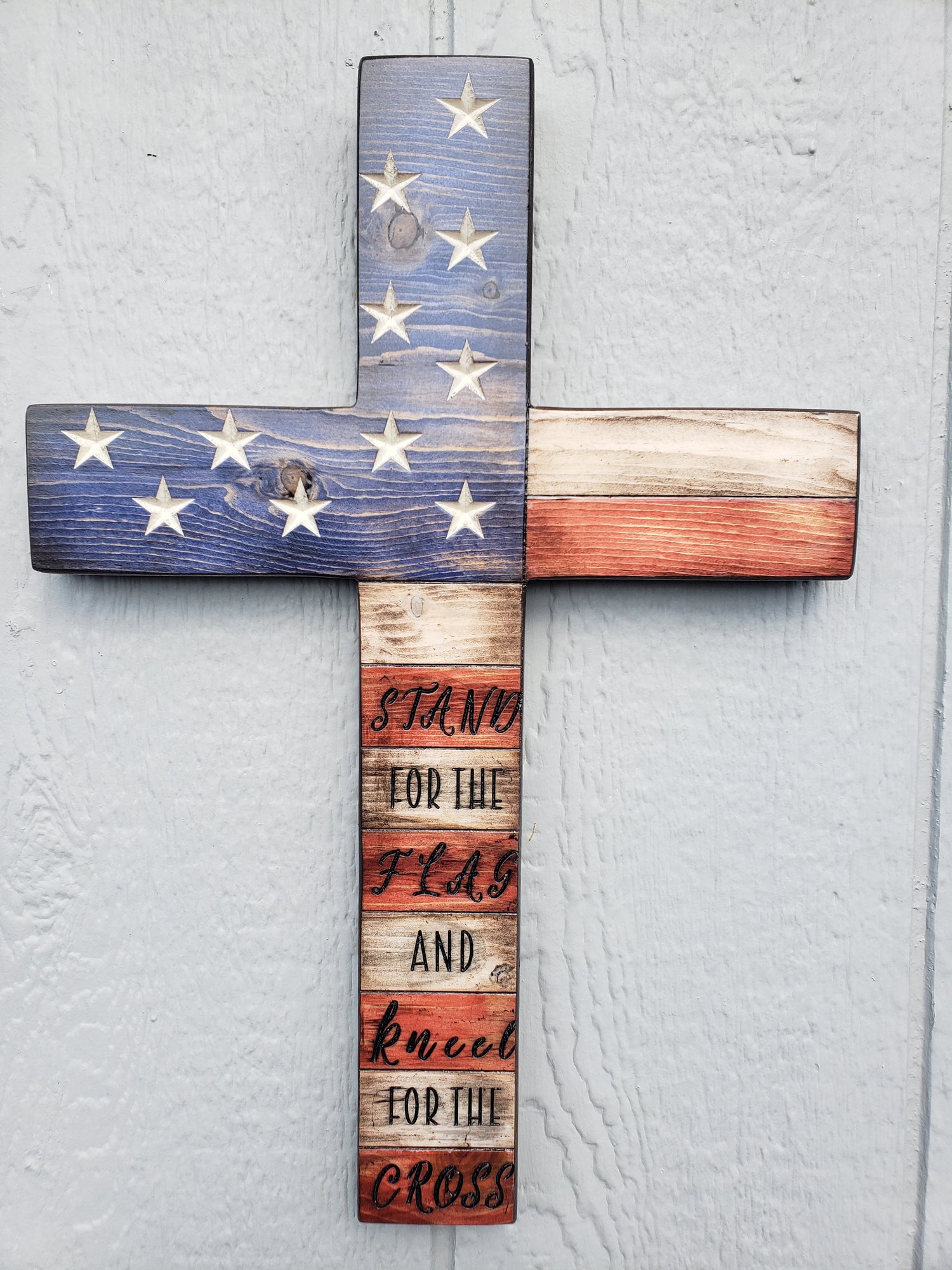 17" Wooden American Flag Cross - Handmade with pine | Ready to Hang | Heavy Duty and Durable | Carved Stars