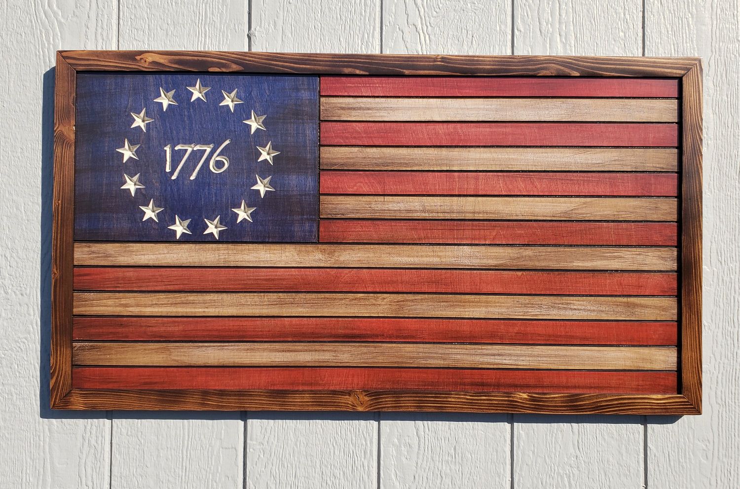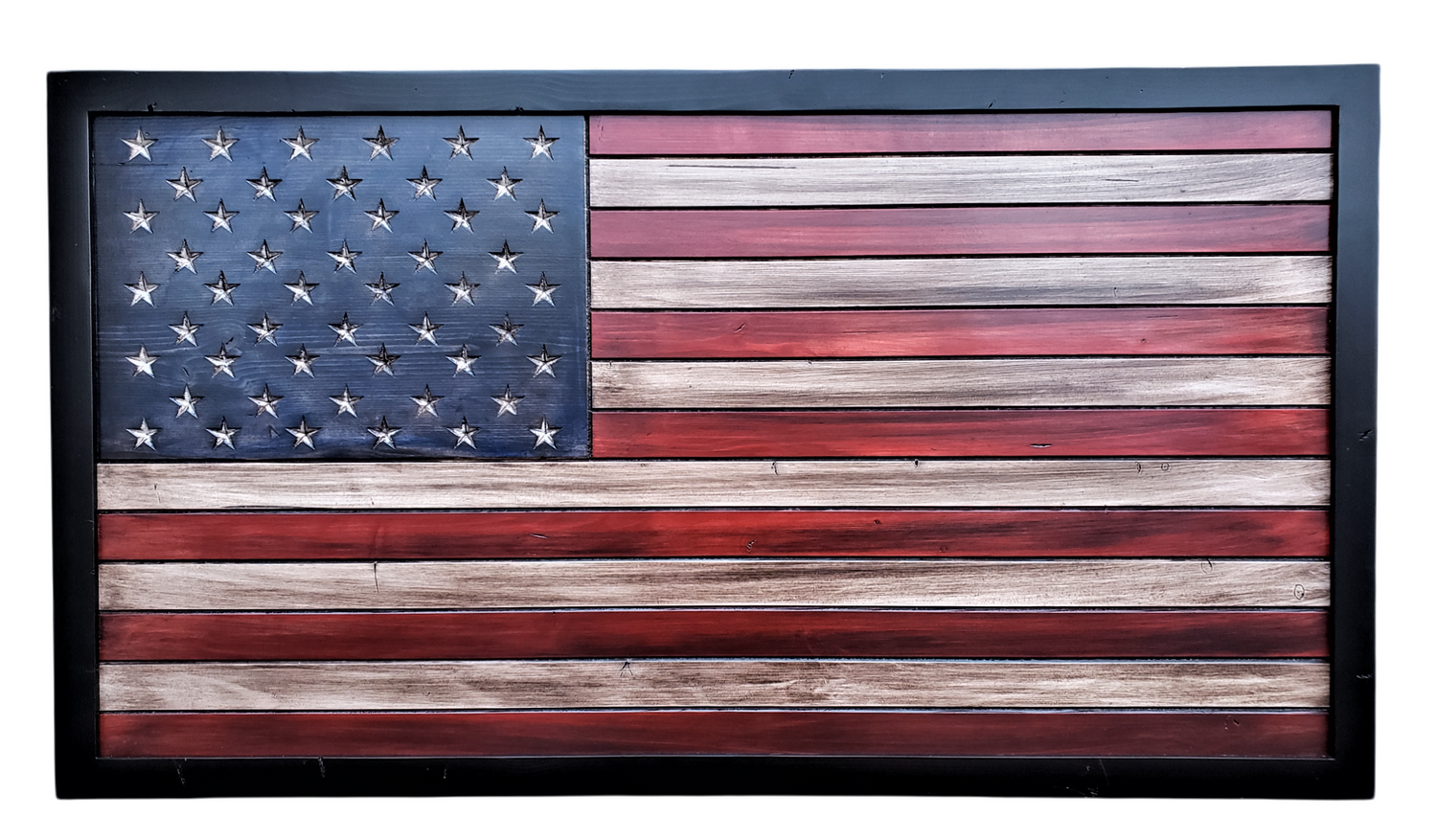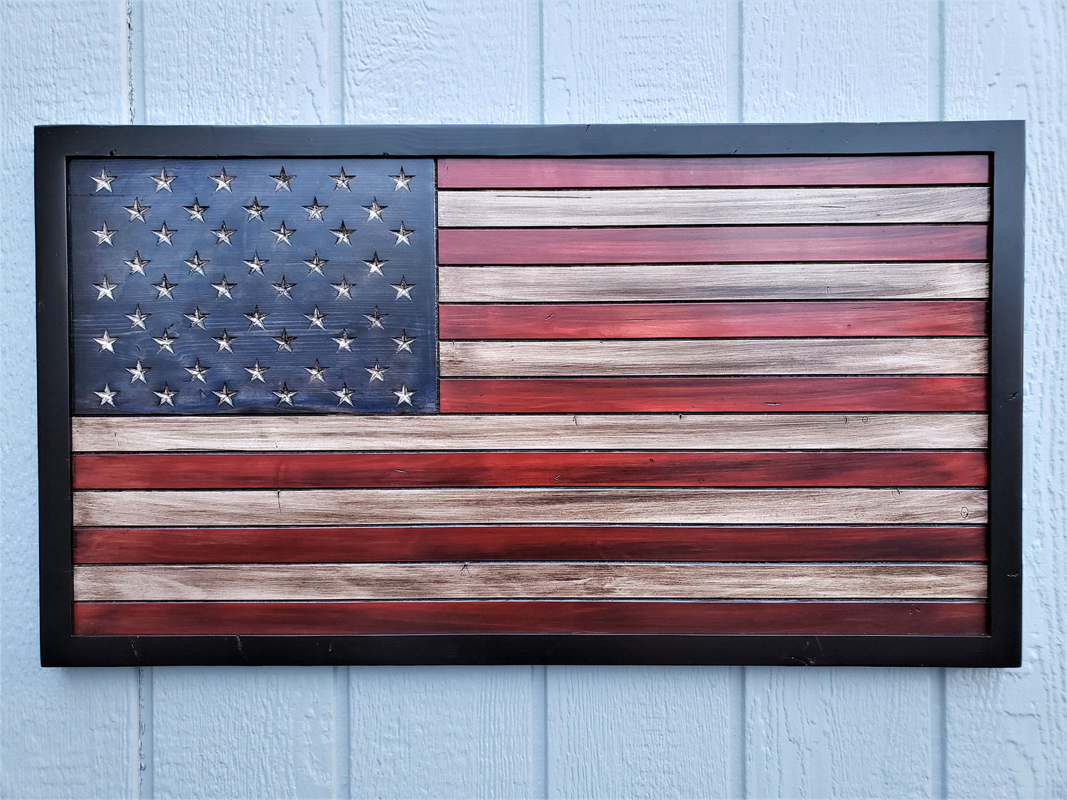 This flag features a separate wooden frame and installed hanging wire for mounting. The removable wooden frame allows room for expanding and contracting of the wood without breaking the frame and allows for an upgraded custom carved frame or a frame replacement in the event the frame is damaged.