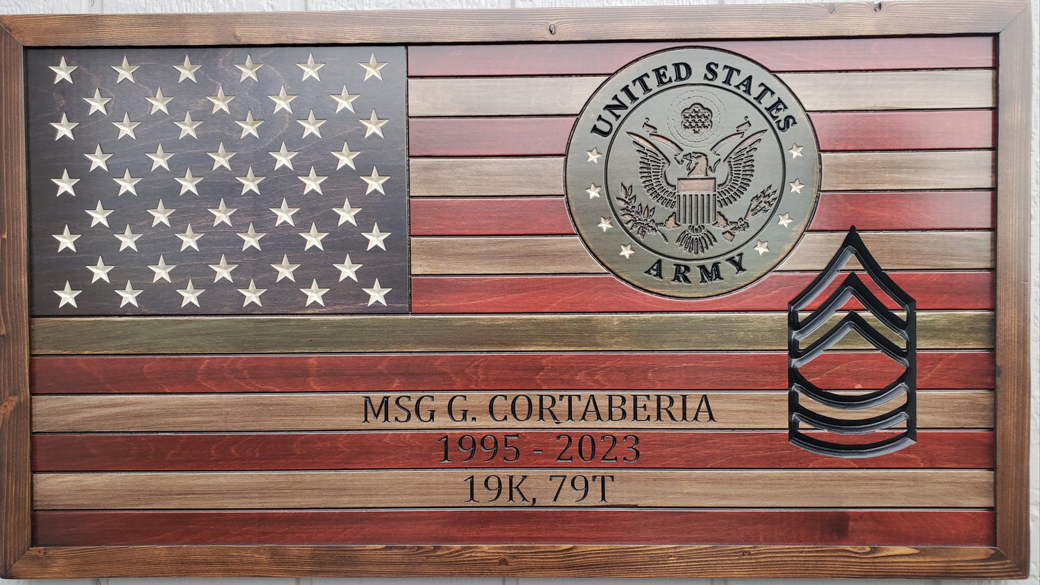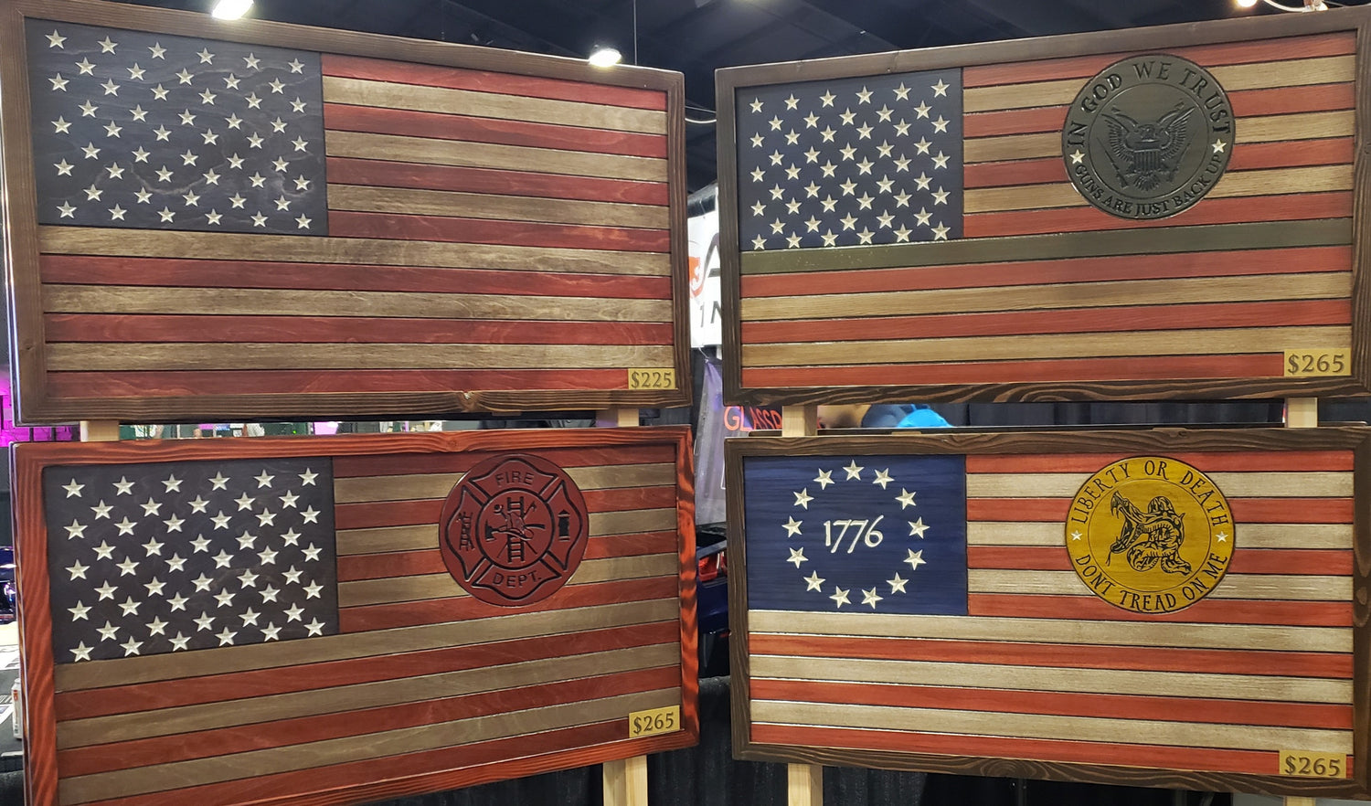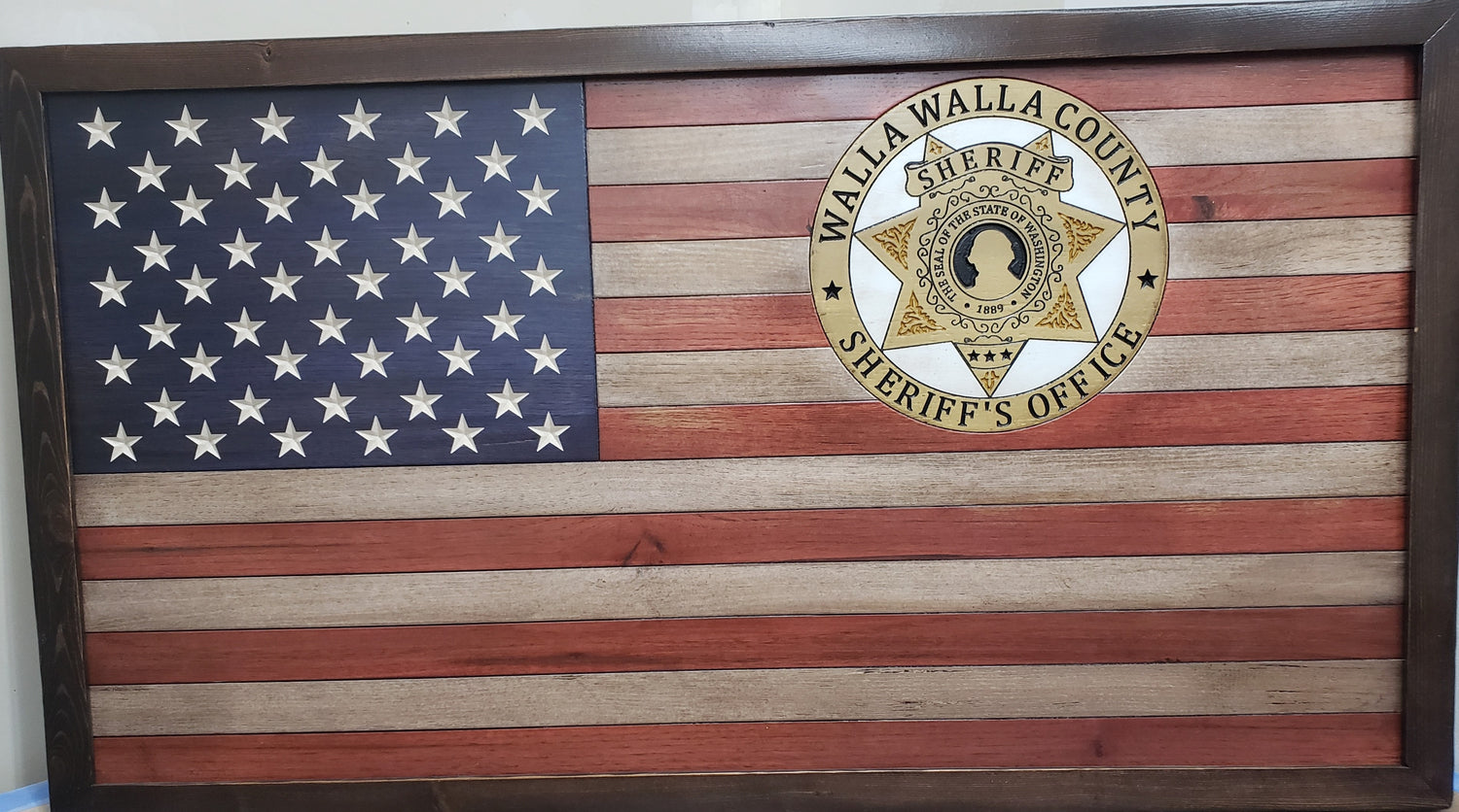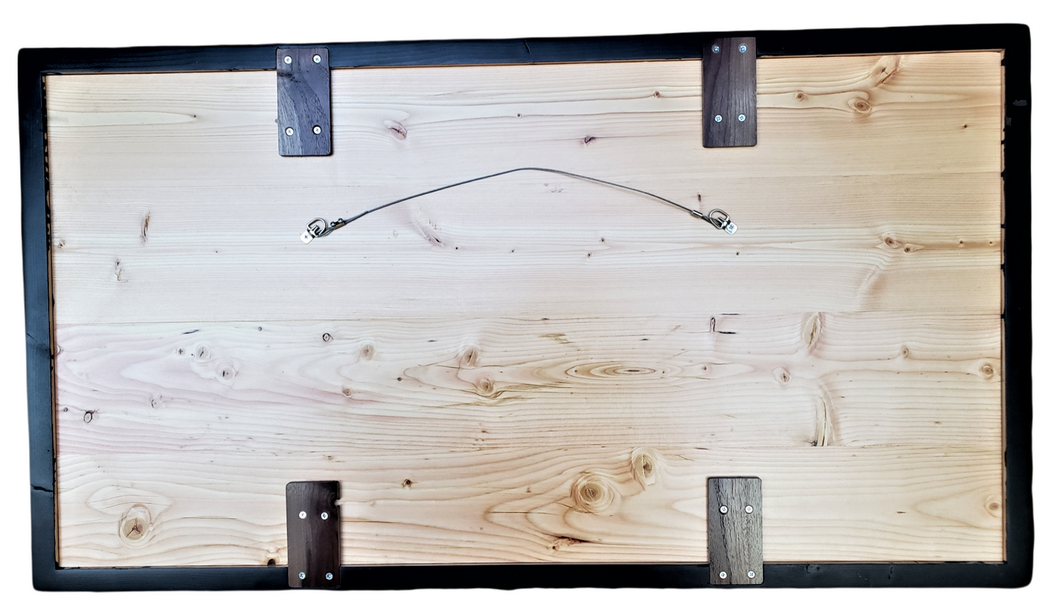 This flag features a separate wooden frame and installed hanging wire for mounting. The removable wooden frame allows room for expanding and contracting of the wood without breaking the frame and allows for an upgraded custom carved frame or a frame replacement in the event the frame is damaged.
